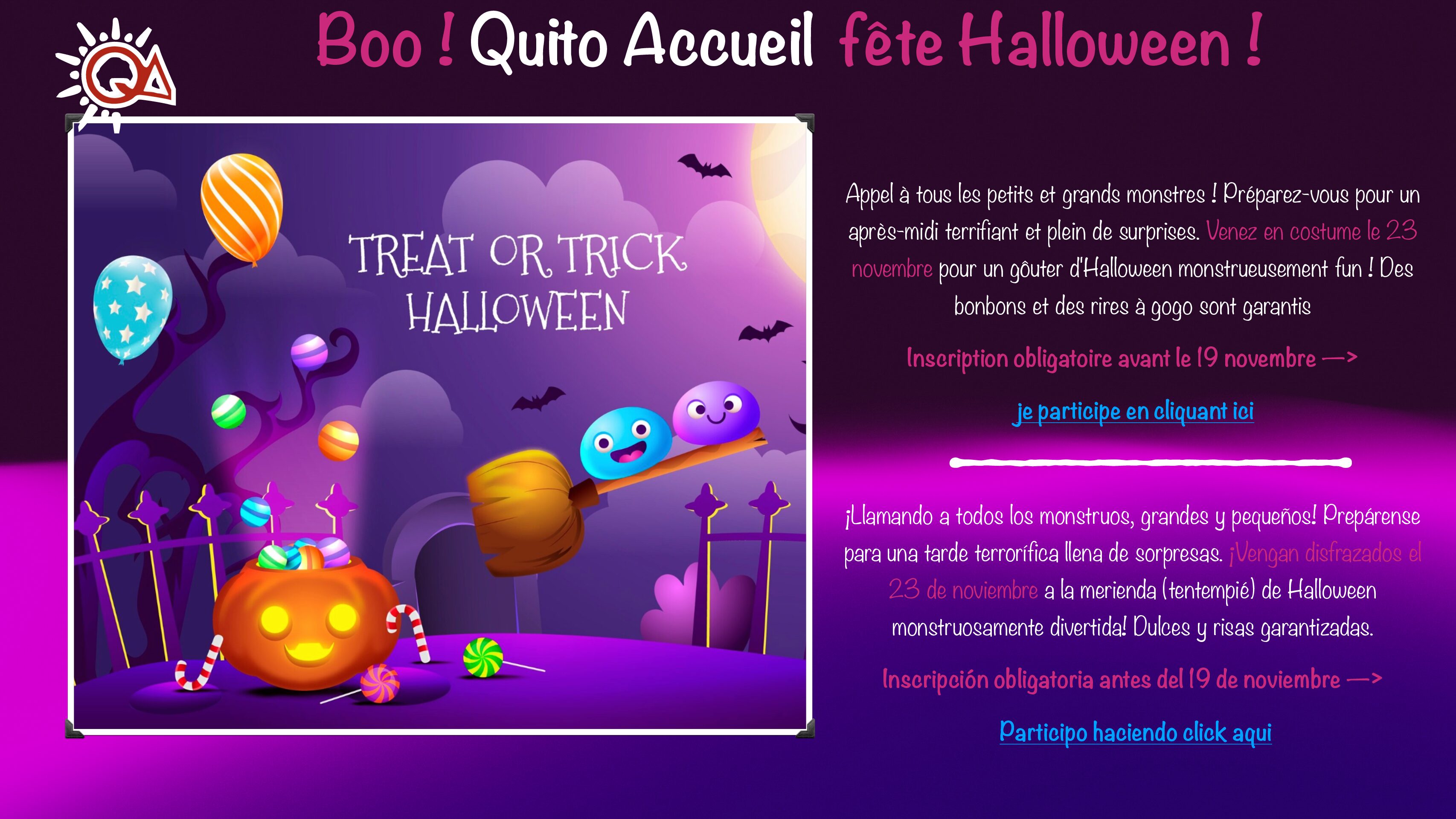🎃 Invitation au Goûter d’Halloween ! 🕸️ Quito Accueil a le plaisir de convier les enfants et adolescents à un après-midi festif et effrayamment amusant à l’occasion d’Halloween ! 📅 Date : Dimanche 23 novembre 🕝 Heure : À partir de 14h30 📍 Lieu : l’adresse exacte et la localisation seront communiquées aux participants. 👻 […]